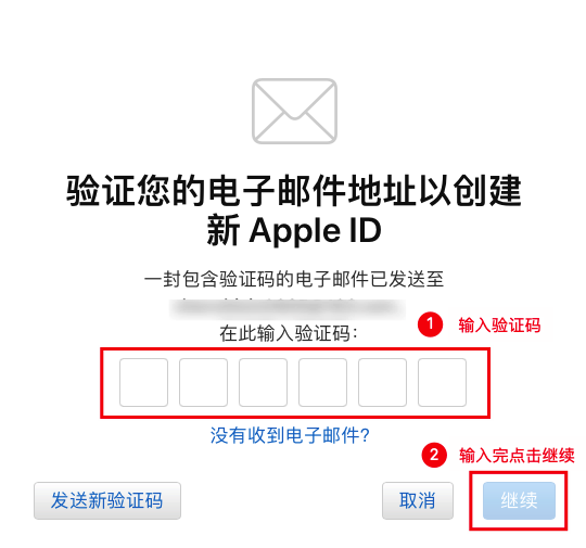 填写完所有的信息点击继续之后,这时会收到一封验证Apple ID的电子邮件,需要把邮箱验证码填写上去
