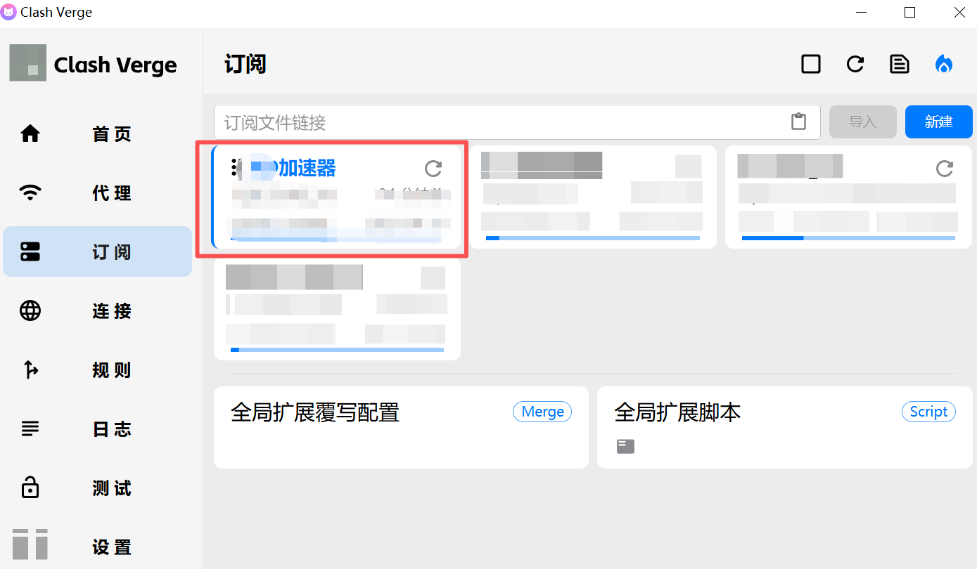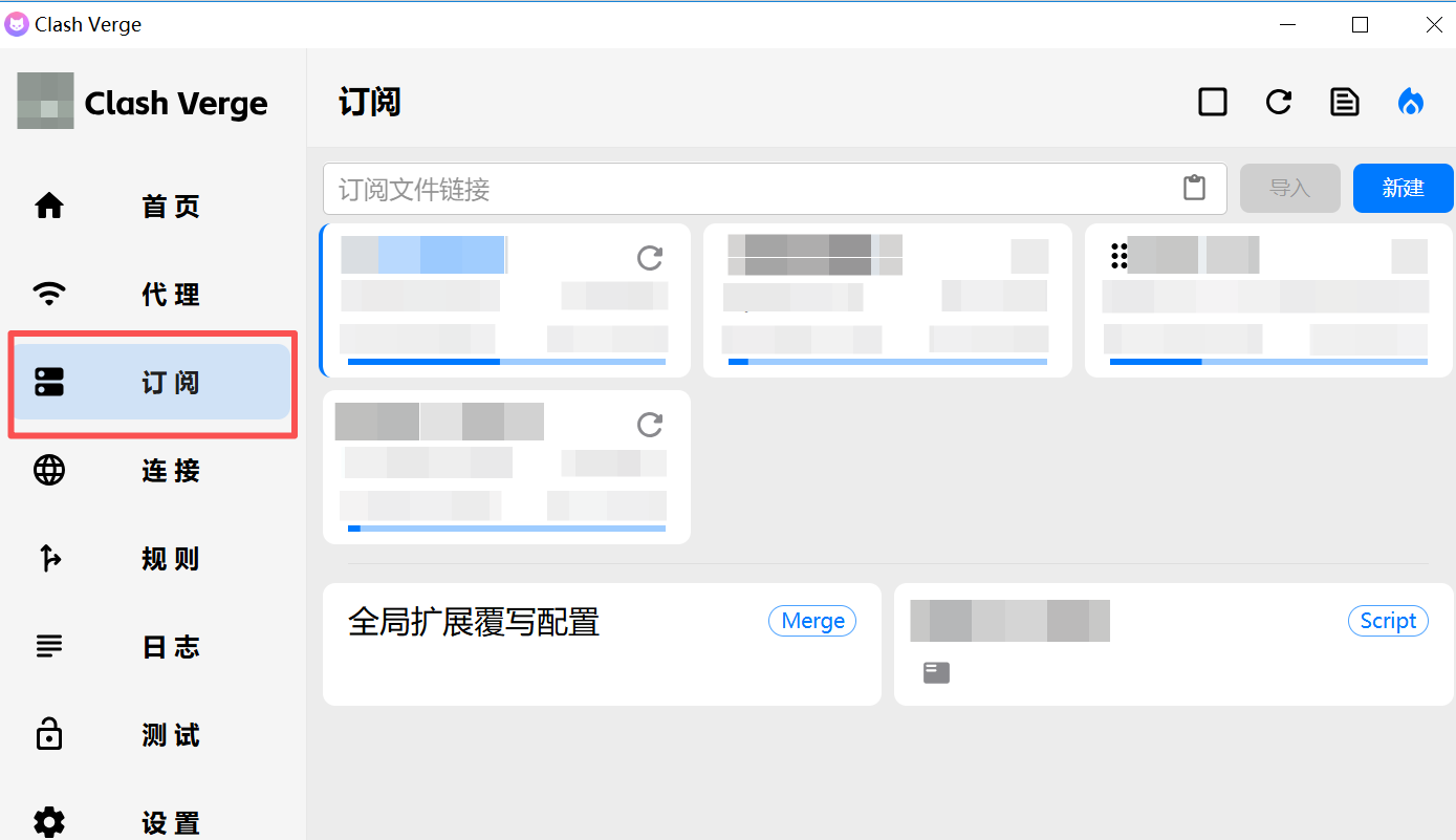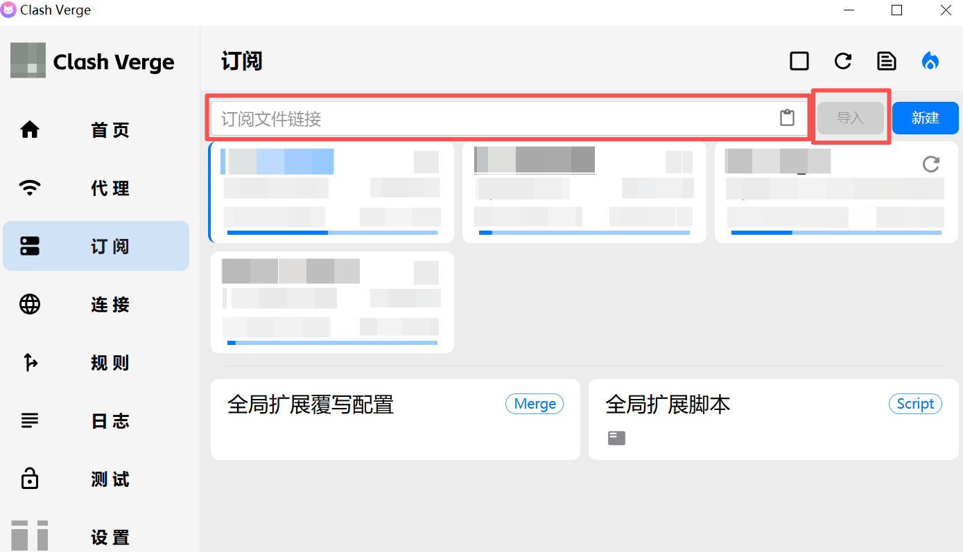 2、在窗口右侧 【订阅】 页面顶部,粘贴 Clash verge订阅链接,随后点击 【导入】