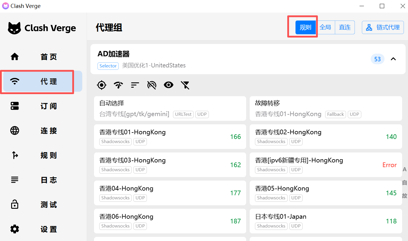 1、点击Clash verge 窗口左侧的代理,然后右侧顶部选择【规则】