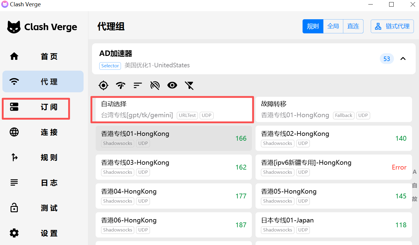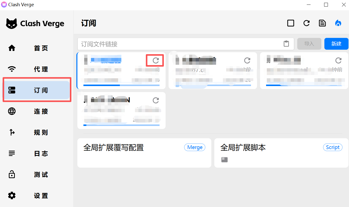 3、如果发现某些线路无法使用,点击clash verge里面【订阅】里的订阅配置文件中刷新按钮进行刷新线路