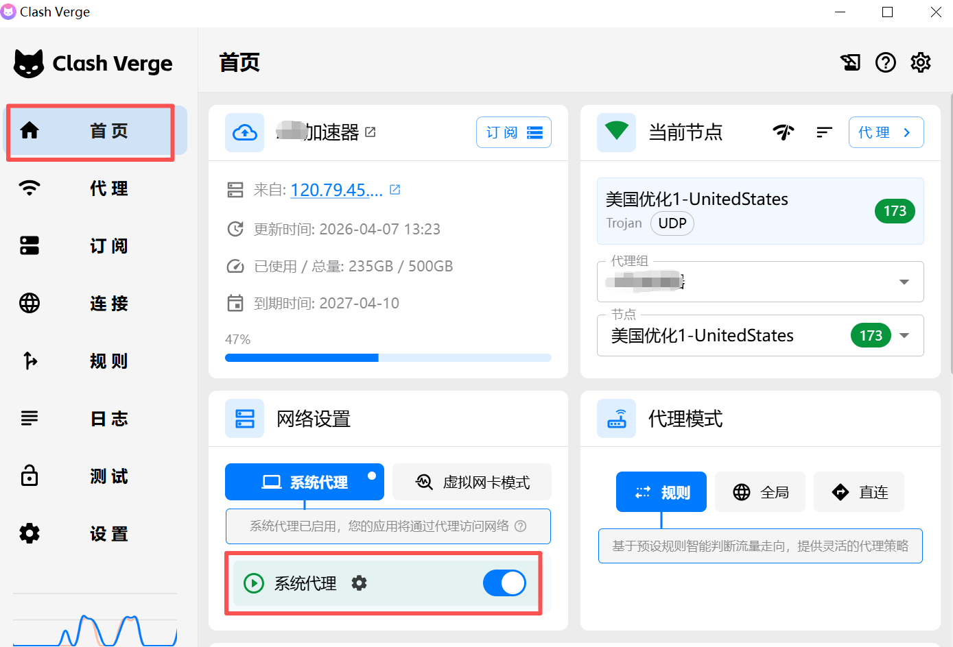 1、点击Clash verge 窗口左侧的首页,重新勾选"系统代理"选项