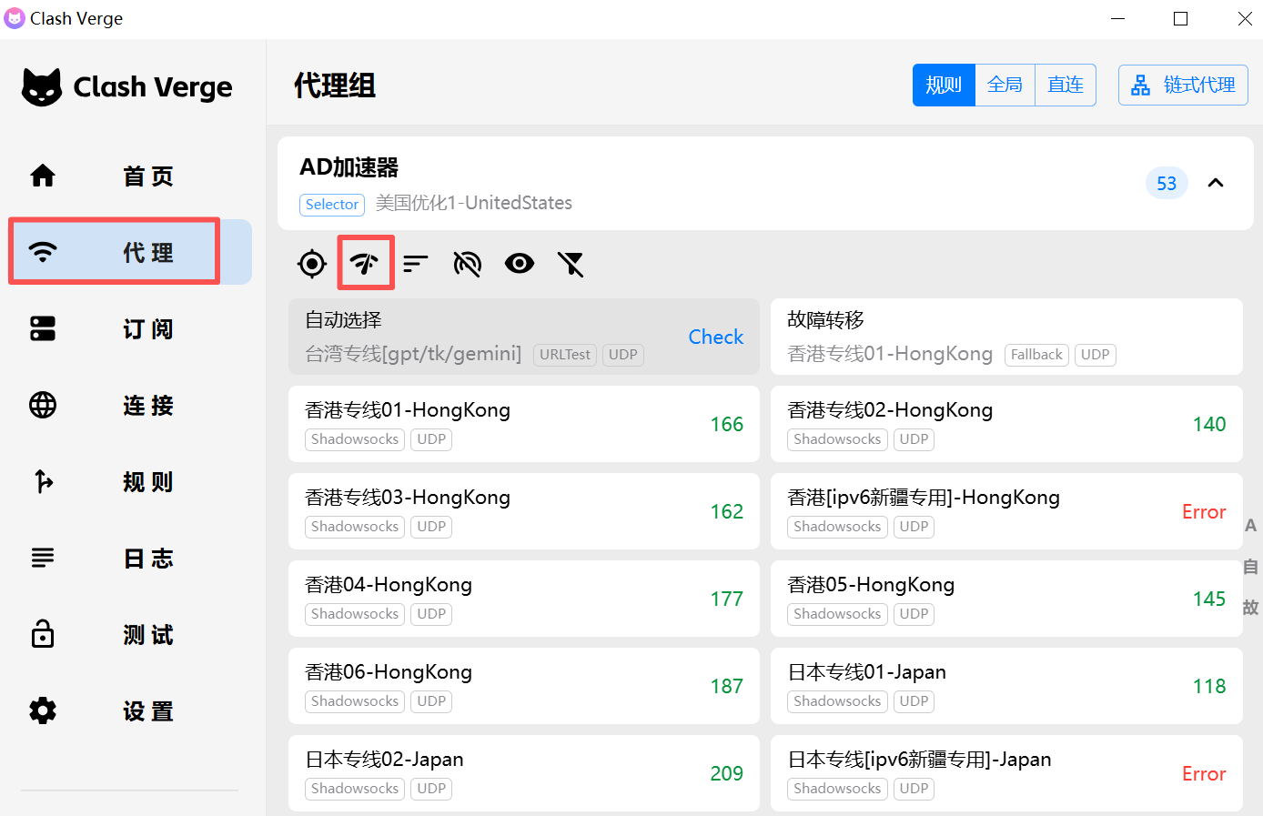 4、如果需要对某些线路进行测速,请点击【代理】里的WiFi按钮进行测速